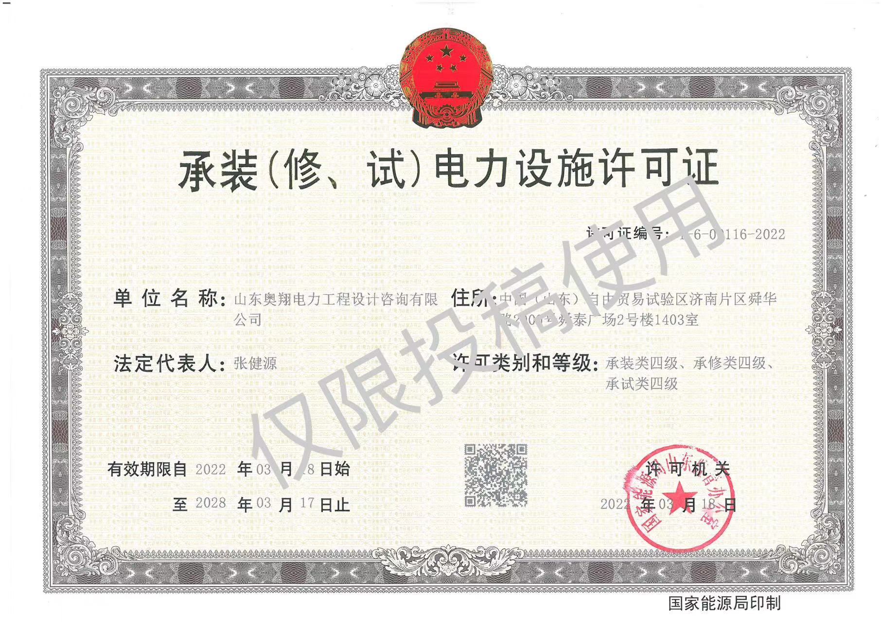 水發能源奧翔設計院取得電力承裝(修、試)四級資質