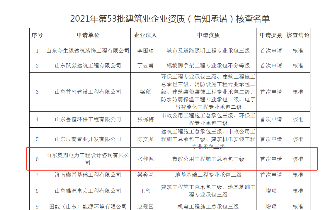 近日,濟南市行政審批服務局發布《關于2021年第53批建筑業企業資質(告知承諾)核查名單的通告》,山東奧翔電力工程設計咨詢有限公司獲得由濟南市行政審批服務局頒發的電力工程施工總承包三級資質。
